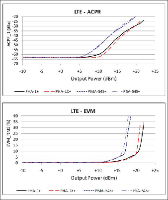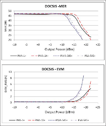 A summary of performance over a range of output powers is the ideal means of comparison and model selection. These measurements were automated using the same equipment to sweep input power. However, since each amplifier has different gain, the measurements are all referenced to the power at the output of the device. Performance relative to commonly used LTE and DOCSIS signals are shown in Figure 2 and Figure 3.