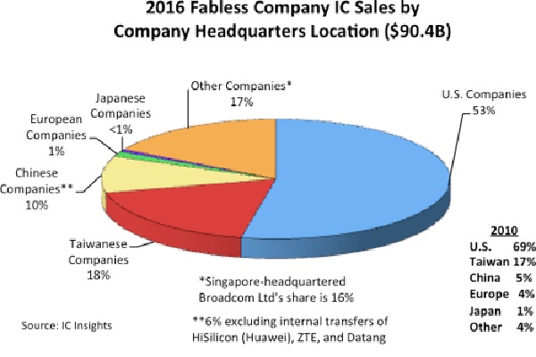 Figure 1 depicts the 2016 fabless company share of IC sales by company headquarters location. As shown, at 53%, the U.S. companies held the dominant share of fabless IC sales last year, although this share was down from 69% in 2010 (due in part to the acquisition of U.S.-based Broadcom by Singapore-based Avago). Although Avago, now called Broadcom Limited after its merger with fabless IC supplier Broadcom became official on February 1, 2016, has fabrication facilities that produce III-V discrete devices, it does not possess its own IC fabrication facilities and is considered by IC Insights to be a fabless IC supplier.