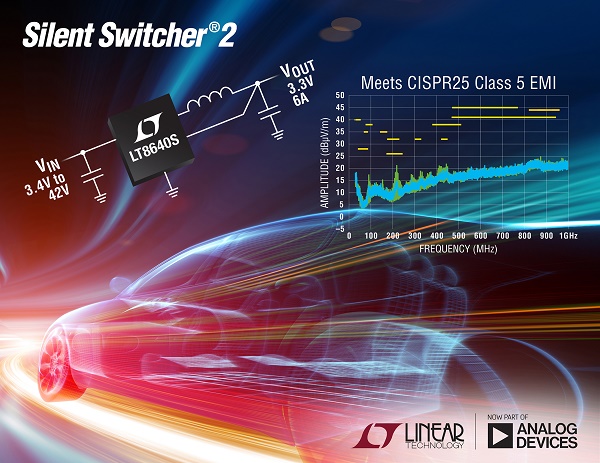 MILPITAS, CA & NORWOOD, MA – April 13, 2017 – Analog Devices, Inc., which recently acquired Linear Technology Corporation, announces the LT8640S, a 6A, 42V input synchronous step-down switching regulator. Its unique Silent Switcher® 2 architecture uses two internal input capacitors as well as internal BST and INTVCC capacitors to minimize the area of the hot loops. Combined with very well controlled switching edges and an internal construction with an integral ground plane and the use of copper pillars in lieu of bond wires, the LT8640S’s design dramatically reduces EMI/EMC emissions. This improved EMI/EMC performance is not sensitive to board layout, simplifying design and reducing risk even when using two layer PC boards. The LT8640S can easily pass the automotive CISPR 25, Class 5 peak EMI limits with a 2MHz switching frequency over its entire load range. Spread spectrum frequency modulation is also available to lower EMI/EMC levels further.
