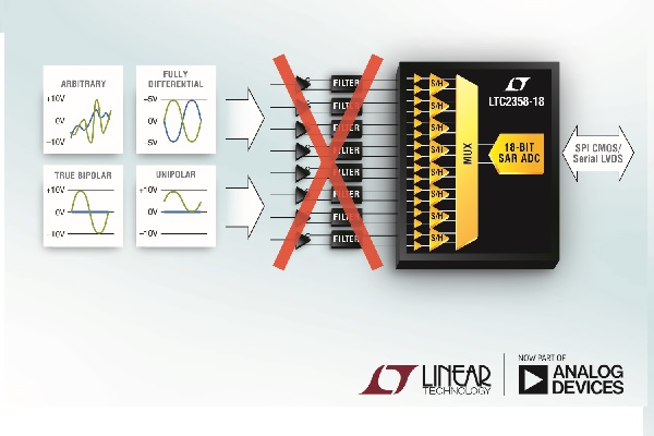Analog Devices, Inc., which recently acquired Linear Technology Corporation, announces the LTC2358-18, an 18-bit, 8-channel simultaneous sampling successive approximation register (SAR) ADC featuring integrated picoamp input buffers. With board real estate at a premium, the LTC2358-18 brings substantial space and cost savings by eliminating front end signal conditioning circuitry normally required to drive unbuffered switched-capacitor ADC inputs. The combined component savings of three amplifiers, six resistors and two capacitors for each channel, a total of 88 components over 8 channels, saves BOM cost and significant board space and provides over 40% savings in power consumption. Picoamp inputs and 128dB CMRR over a 30VP-P common mode range enable the LTC2358-18 to directly connect to a wide range of sensors without compromising measurement accuracy.