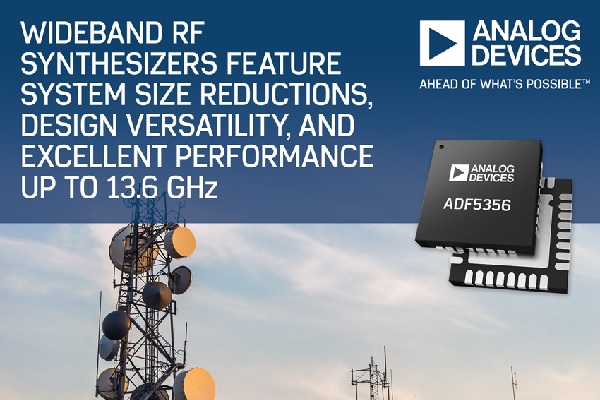 Analog Devices, Inc. today announced the ADF5356, a 13.6 GHz next-generation wideband synthesizer with integrated voltage-controlled oscillator (VCO) which targets applications such as wireless infrastructure, microwave point-to-point links, electronic test and measurement, and satellite terminals. A complimentary synthesizer product, the ADF4356, operates to 6.8 GHz and is comparable in performance.