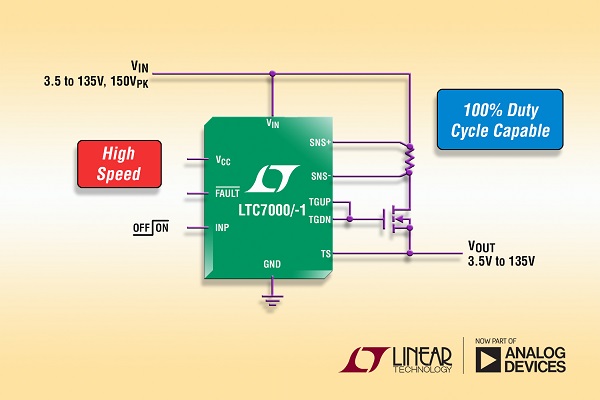 Analog Devices, Inc., which recently acquired Linear Technology Corporation, announces the LTC7000/-1, a high speed, high side N-channel MOSFET driver that operates up to a 150V supply voltage. Its internal charge pump fully enhances an external N-channel MOSFET switch, allowing it to remain on indefinitely. The LTC7000/-1’s powerful 1Ω gate driver can drive large gate capacitance MOSFETs with very short transition times, ideal for both high frequency switching and static switch applications.