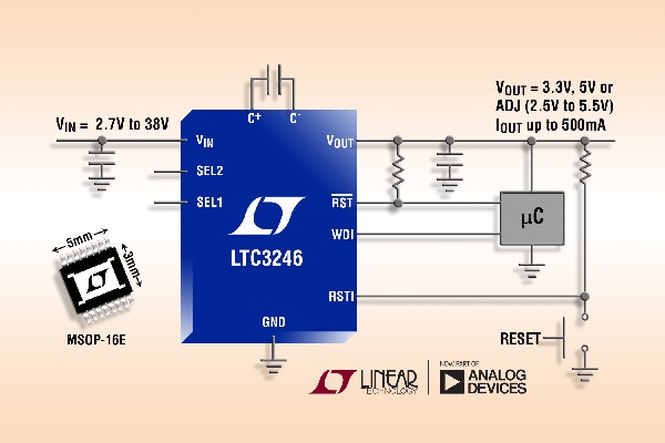 Analog Devices, Inc., which recently acquired Linear Technology Corporation, announces the LTC3246, a compact, low noise buck-boost charge pump with integrated watchdog timer capable of up to 500mA of output current.