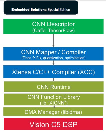vision c5 software flowWonderful hardware is not a lot of use if it is too difficult to program. There are standard open-source CNN frameworks such as Caffe and TensorFlow that are the most common way to develop in the space. These flow cleanly into the CNN mapper and then all the way down to the Vision C5 DSP.