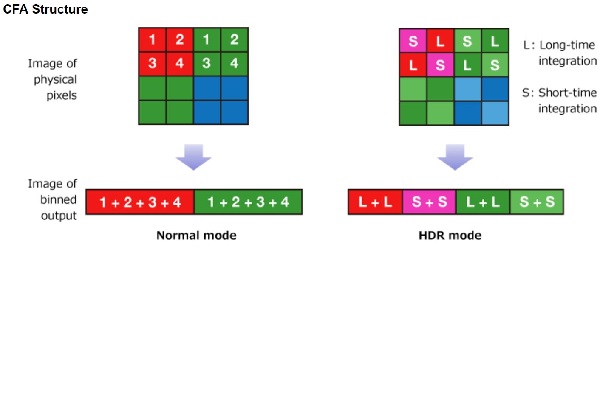 The IMX294 uses a Quad Bayer structure which outputs 2×2 binned pixels in normal mode. In HDR mode, two pixels of the quad array are used for a short exposure and the other two for a long one (Fig. 1). This eliminates the temporal delay between short and long exposures seen in common two image HDR implementations, resulting in HDR images with minimal artifacts when imaging moving objects. (Fig. 2).