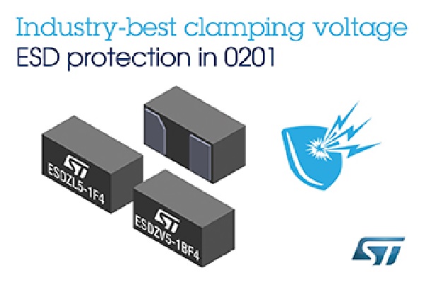 New miniature (0201-size) single-line ESD-protection diodes from STMicroelectronics quickly clamp transients to a voltage as low as 7V, and handle 7A peak pulse current, to provide superior protection and design flexibility for space-constrained smart objects. This diode drops the bar with the lowest clamping voltage available at this level of capacitance and stand-off voltage.
