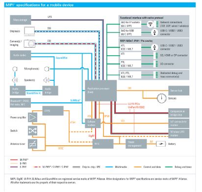 Each new generation of modern mobile phones enters the market with new features such as additional sensors, higher display resolutions and an extended range of equipment. The numerous components inside these devices communicate quickly and efficiently via common interfaces to offer smooth functionality. The most widely used standards for hardware and software interfaces in mobile phones are from the non-profit MIPI Alliance, which consists of more than 280 member companies. According to the MIPI Alliance, at least one of their standards is implemented in every modern smartphone and in about 90 % of all classic mobile phones. The MIPI standards, which are constantly evolving, are also used in tablets and digital cameras as well as products for the automotive and health care sector. Fig. 2 shows the current status.