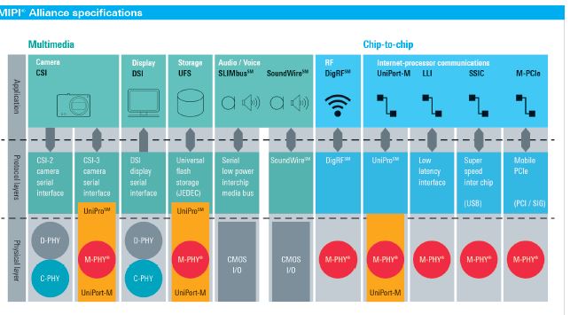 D-PHY, the most commonly used specification, supports camera and display applications. The recently published specification for C-PHY describes an efficient unidirectional streaming interface with low-speed, in-band reverse channel, which should replace D-PHY for higher speed requirements in the future. The third specification, M-PHY, supports a broader range of applications, including interfaces for display, camera, audio, video, memory, power management and interchip communications, for example, between baseband chips and those for RF. In addition, it was adopted as a physical layer for protocols outside of the MIPI ecosystem such as Mobile PCIe (M-PCIe) and SuperSpeed Inter-Chip (SSIC) USB.