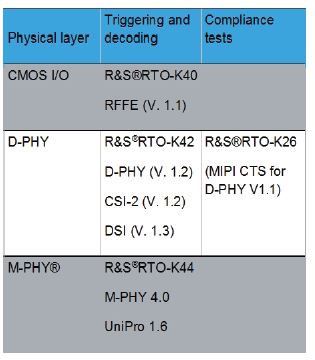 The Rohde & Schwarz’ R&S RTOs for example are oscilloscopes which the user can configure perfectly for analyzing MIPI interfaces. They offer different software options for analyzing MIPI-based protocols and their respective physical layers (Fig. 4). The following sections describe how a R&S RTO effectively handles all T&M requirements of the MIPI standards. Although both the D-PHY and M-PHY MIPI standards serve as examples, the arguments also apply to the other MIPI options offered by the R&S RTO.