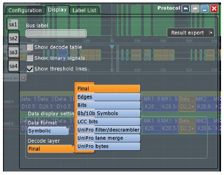 The data format and the layer to be decoded is set in a second step. Being able to choose layers is useful for debugging errors on different protocol levels, starting from the edge transitions, to the bits and symbols, up to the upper UniPro protocol layers (Fig. 9).
