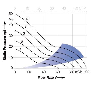 If we consider the air flow calculated previously, the curve indicates that the pressure loss would be 11Pa. We then know that a fan able to generate an air flow of 84.5m3/hr into a pressure loss of 11Pa is required. Each fan manufacturer will publish a graph for every fan indicating the air flow at differing pressure losses. In the example below, Figure 2, curves are given for 5 fans. The light coloured cone shows the optimum operating range for each of the 5 fans. In our example, fan 5 would need to be used to ensure the required air flow of 84.5m3/hr with a pressure drop of 11Pa.