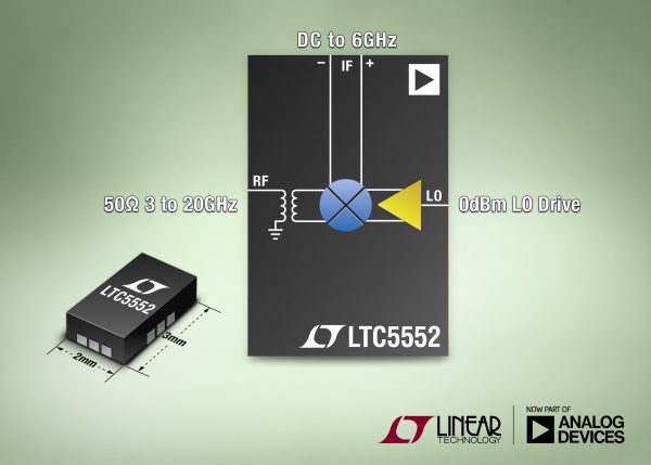 MILPITAS, CA & NORWOOD, MA – August 14, 2017 – Analog Devices, Inc., which recently acquired Linear Technology Corporation, announces the LTC5552, a double balanced mixer that features best-in-class wideband matching from 3GHz to 20GHz. The mixer can be used as an up- or downconverter. The LTC5552 is especially useful in upconversion applications with its DC capable differential IF port that enables the LO to be close in frequency to the RF. Its low LO to RF leakage of less than –25dBm greatly eases the burden on the external filter. Additionally, the mixer delivers excellent linearity of 20.1dBm IIP3 at 14GHz, and 18.3dBm at 17GHz. The device integrates a broadband LO buffer, requiring only 0dBm drive and effectively eliminating an external high power LO amplifier circuit. Moreover, the LTC5552 integrates a wideband balun transformer in its RF port, allowing single-ended 50Ω matched operation over its specified frequency range. All these features result in minimum external components, simplified design and a very small solution size.