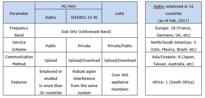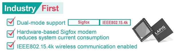 The ML7404 is the first wireless communication LSI in the industry to feature LPWA dual-mode functionality, supporting both the Sigfox standard (subscription-based LPWA using unlicensed sub-GHz), which has been adopted in more than 30 countries and expanding in metropolitan areas including Japan, and the international protocol IEEE802.15.4K that is extremely robust against interference from the same system and has the capacity to cover more terminals under one network. This dual-mode capability enables use in a wide range of applications/specifications.