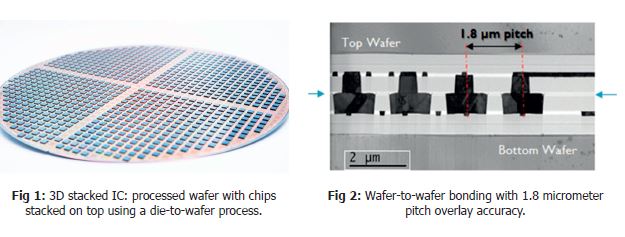 With advanced CMOS scaling, new opportunities for 3D chip integration with even higher interconnect densities and smaller pitches arise. Rather than realizing a SOC as a single chip, it has now become possible to realize different functional partitions of a SOC circuit. Stacking such partitions results in a so-called 3D system-on-chip. These are packages in which partitions with varying functions and technologies are stacked heterogeneously, with interconnect densities below 5 micrometer. The system partitioning can be done at different levels of the interconnect hierarchy – at the global wiring level (long wires, cross chip), intermediate wiring level, or local wiring level (short wires, interconnecting e.g. intra-core modules). The main technological approach to stack these partitions is wafer-to-wafer bonding – either through hybrid (via middle) wafer-to-wafer bonding or dielectric (via last) wafer-to-wafer bonding techniques. This is achieved by aligning top and bottom wafers that are then bonded. Recently, excellent results in wafer-to-wafer overlay accuracy have been obtained, for both hybrid bonding (1.8 micrometer pitch) and dielectric bonding (300nm overlay across wafer). Accurate overlay is needed to align the bonding pads of the stacked wafers and it is essential to achieving a high yield.