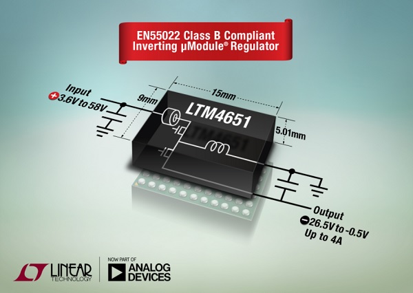 Analog Devices, Inc., which recently acquired Linear Technology Corporation, announces the LTM4651, a nonisolated inverting output µModule® regulator that can generate –26.5V to –0.5V output from a positive input supply voltage. The LTM4651 operates over a 3.6V to 58V input voltage range and is housed in a 15mm x 9mm x 5.01mm BGA package, a compact solution, providing –5VOUT,