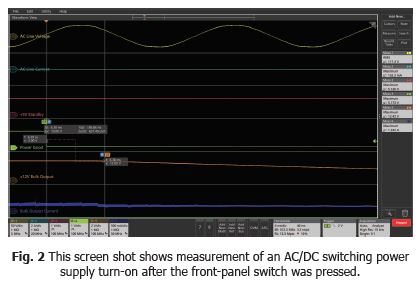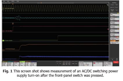 The switching power supply under test in the screen shot below produces a high-current, regulated 12 VDC output. This power supply is remotely controlled with a switch on the front panel of the instrument. Shortly after the switch is pressed, the +5 V standby voltage is turned on, enabling the switching converter to start. After the +12 V output is in regulation, the Power Good (PW OK) signal goes high to indicate to the load that the supply is reliable.
