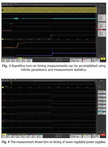One approach is to analyze the power system in blocks – using multiple acquisitions to check the timing block by block. To compare between blocks, one of the rails or a power good/fail signal can be used as a trigger and multiple captures can be taken, determining the startup and shutdown timing relative to the reference signal. Since acquisitions are taken over multiple power cycles, variations in the relative timing of supplies will be difficult to characterize. However, the range of variation of each supply from cycle-to-cycle can be determined by measuring over multiple power cycles using infinite persistence on the oscilloscope.