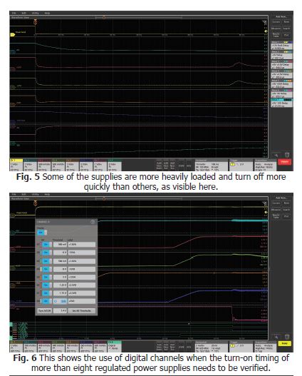 Using an oscilloscope with 8 analog channels cuts the time and hassle significantly versus any of the methods covered so far. With an 8-channel oscilloscope, power supplies with up to eight power rails can be characterized using analog probes. To measure turn-on and turn-off timing relationships on power supplies with more than eight power rails, a mixed signal oscilloscope with digital signal inputs and independently adjustable thresholds can also be used.