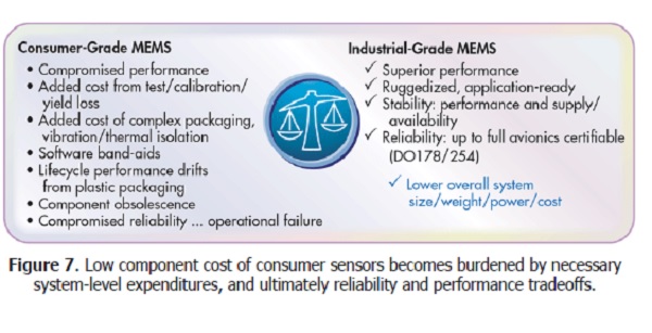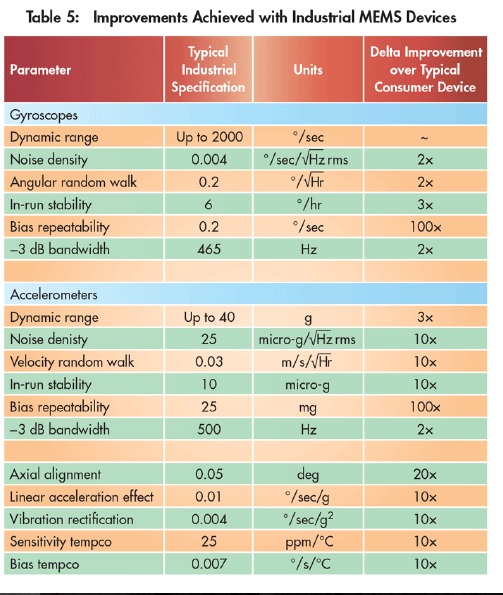 Table 5 shows performance demonstrated in a mid-level industrial device, in comparison to a typical consumer sensor that may be found in a mobile phone. (Note that higher-end industrial devices are also available which are an order of magnitude better than those shown.) Most low-end consumer devices don’t provide specifications for parameters such as linear acceleration effect, vibration rectification, angular random walk, and others that actually can be the largest error sources in industrial applications.