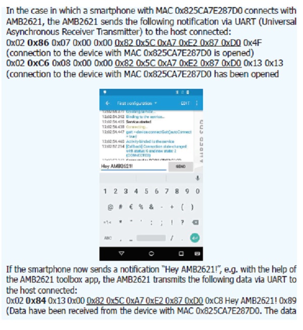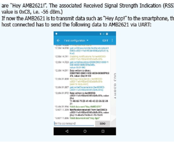 Bluetooth is the “cable replacement” in this application and communication is correspondingly simple. In the above example, in the “Peripheral Only” mode the host would only receive “Hey AMB2621!” without header and checksum bytes and would only need to send “Hey App!” to the module such that these data are transmitted to the smartphone connected.