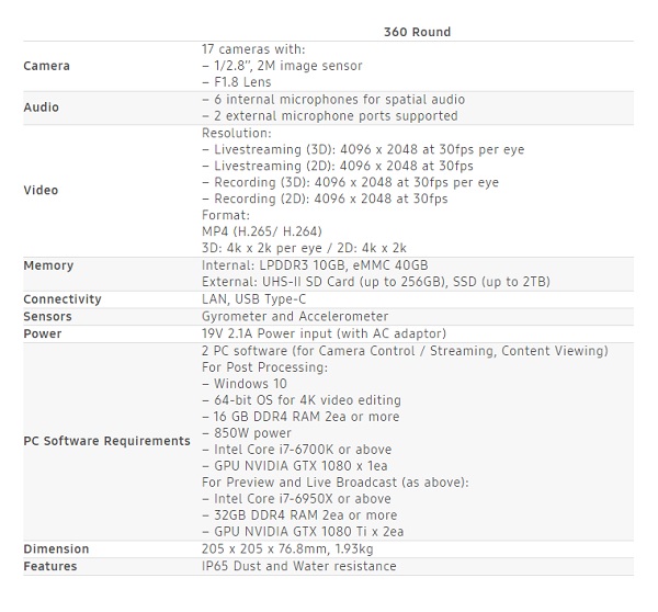 “The Samsung 360 Round is a testament to our leadership in the VR market. We have developed a product that contains innovative VR features, allowing video producers and broadcast professionals to easily produce high quality 3D content,” said Suk-Jea Hahn, Executive Vice President of Samsung Electronics’ Global Mobile B2B Team. “The combination of livestreaming capabilities, IP65 water and dust resistance and 17 lenses makes this camera ideal for a broad range of use cases our customers want—from livestreaming major events to filming at training facilities across various industries.”