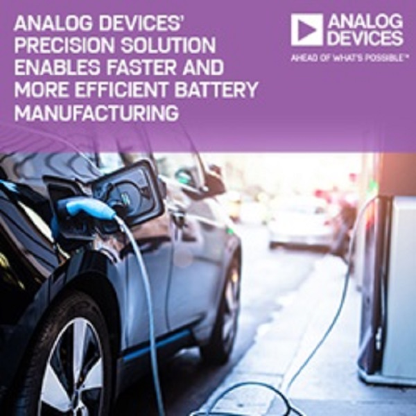 Analog Devices, Inc. today introduced a precision integrated analog front end, controller, and pulse-width modulator (PWM) for battery testing and formation capable of increasing system accuracy and efficiency in lithium-ion battery formation and grading. Compared to conventional technology, the new AD8452 provides 50% more channels in the same amount of space, adding capacity and increasing battery production throughput. The AD8452 uses switching technology that recycles the energy from the battery while discharging and delivers 10 times more accuracy than conventional switching solutions. The higher accuracy allows for more uniform cells within battery packs and contributes to longer living batteries in applications such as electric vehicles. It also enhances the safety of manufacturing processes by providing better detection and monitoring to help prevent over and undercharging which can lead to battery failures. The AD8452 delivers bill of material (BoM) cost savings of up to 50% for charging/discharging boards and potential system cost savings of approximately 20%. System simulating demonstration boards will be available and can enable lower R&D engineering cost and shorter time to market for test equipment manufacturers.