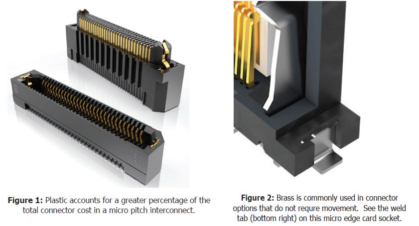 Samtec uses brass components on some connector products, but they are for options what don’t bend or require movement, like the weld tabs on a micro edge card socket. (See Figure 2)