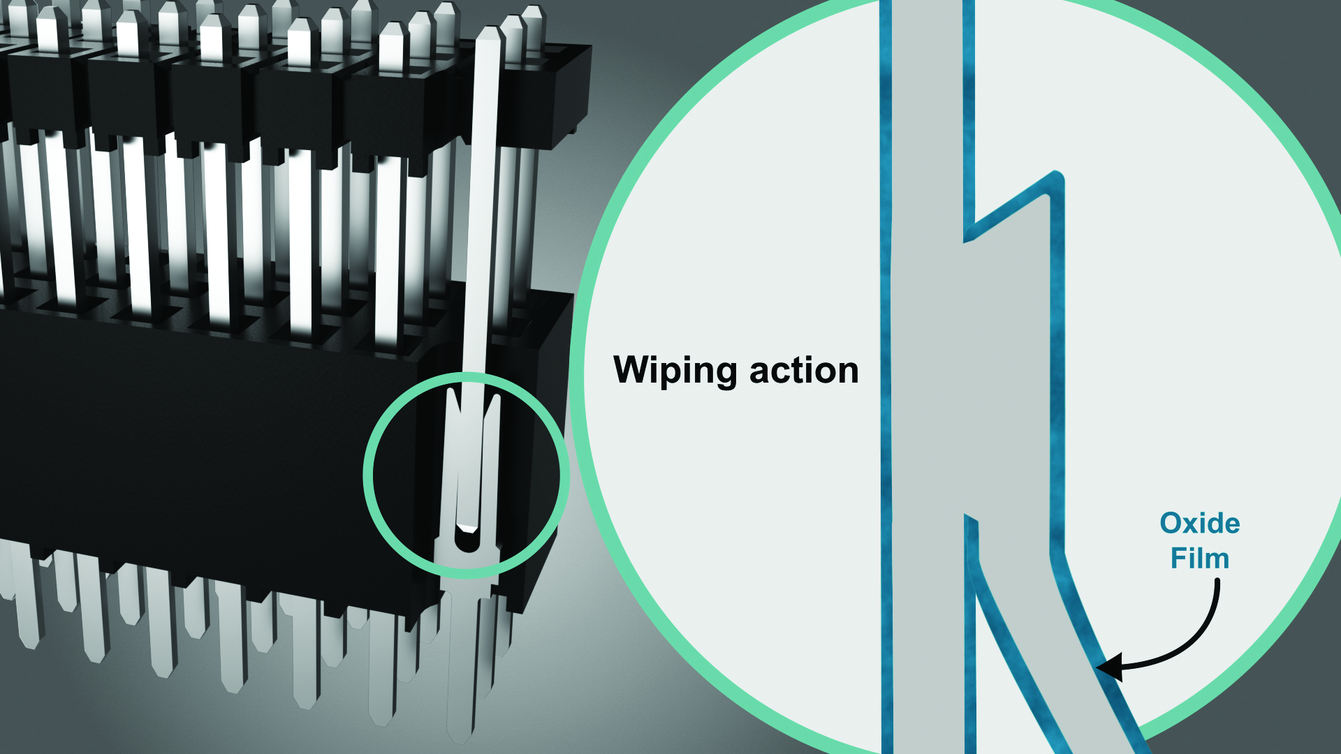 Tin is a lower cost alternative than gold, and has excellent solderability. Unlike gold, tin is not a noble metal. Tin plating starts to oxidize the moment it’s exposed to air. So a tin-plated contact system requires greater normal forces and a longer contact wipe area to break through this oxide film. (See Figure 4)