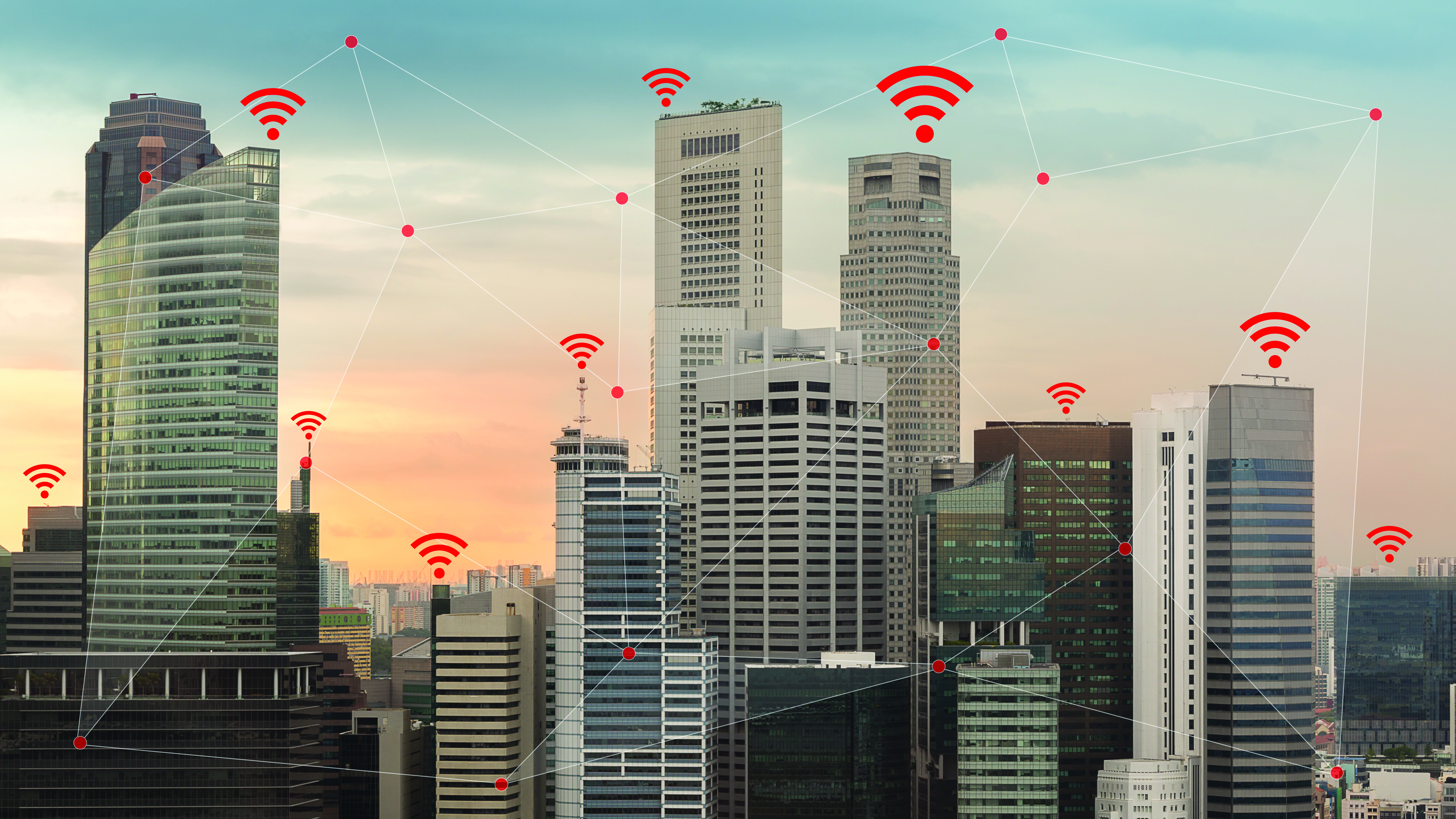 Concept of IOT and smart city illustrated by wireless networking and Wifi icon.