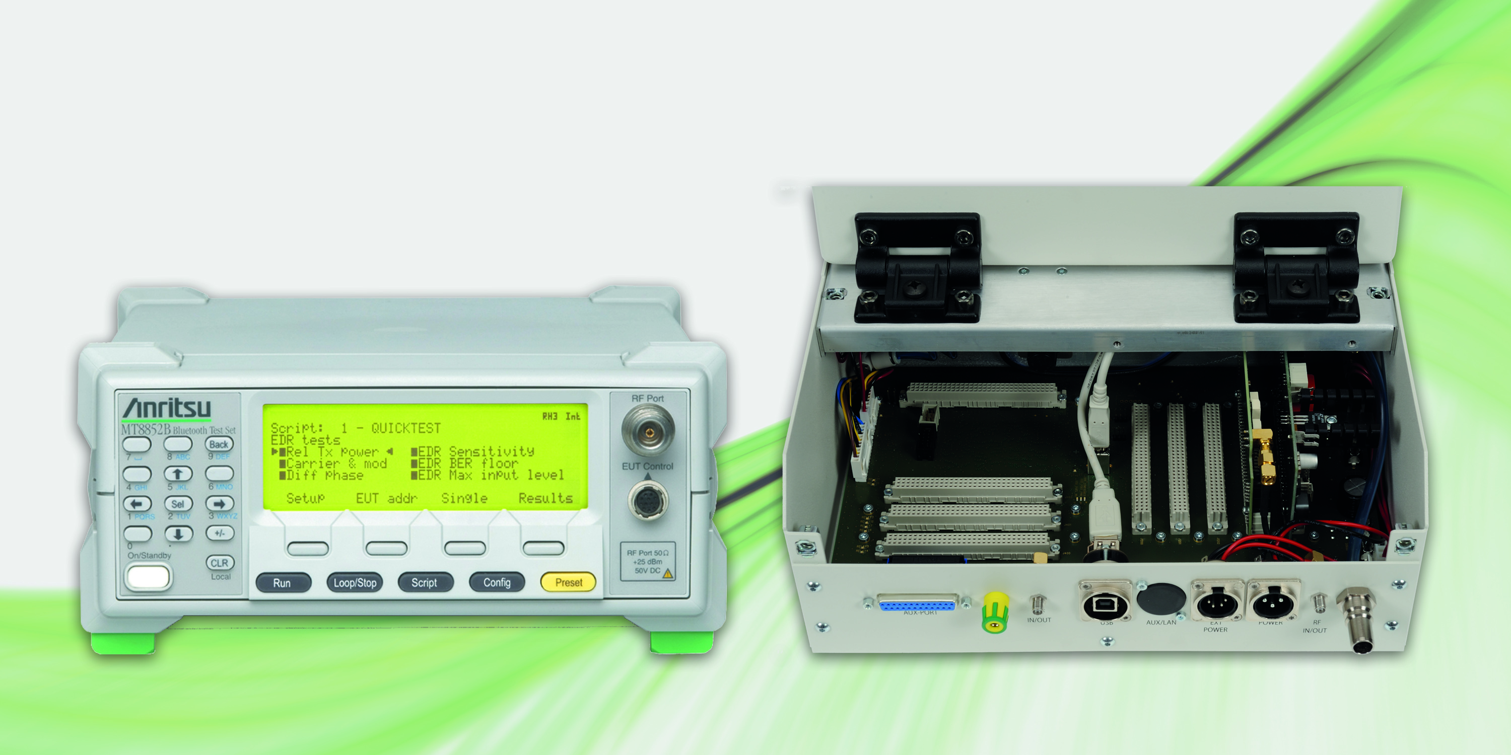The new validated test solution is based on the Anritsu MT8852B Bluetooth test set and the RTX 2300 production test system. Anritsu is an Associate Bluetooth SIG member and helped develop the Bluetooth Core Specification. The MT8852 series has been used worldwide since more than a decade. It supports all Bluetooth standards from 1.2 to 5. It comes with pre-configured test scripts for single-button testing. The equipment under test can be controlled directly from the MT8852B through UART, USB, USB-adaptor, or 2-wire interfaces.