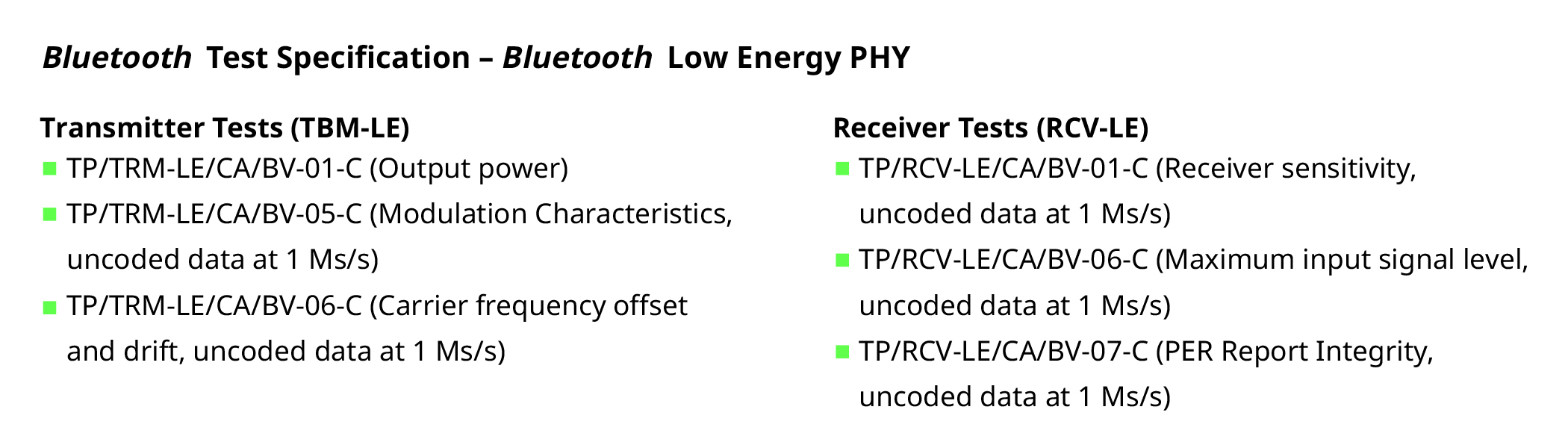 Figure 3. Bluetooth 4.2 test parameters supported by the Anritsu/RTX test system
