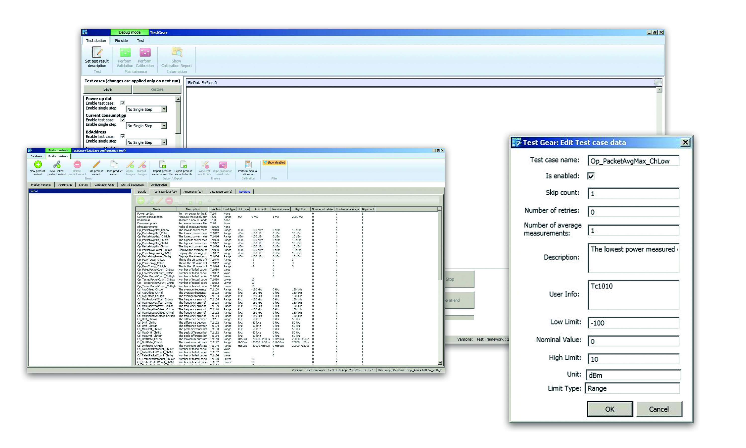 RTX Testgear is a .NET based framework, an integral part of which is a database. This central database contains information about the DUT and all its different variants and revisions, test stimuli and limits definitions, firmware, Bluetooth address pool, MT8852B specific information, and all the collected test data.