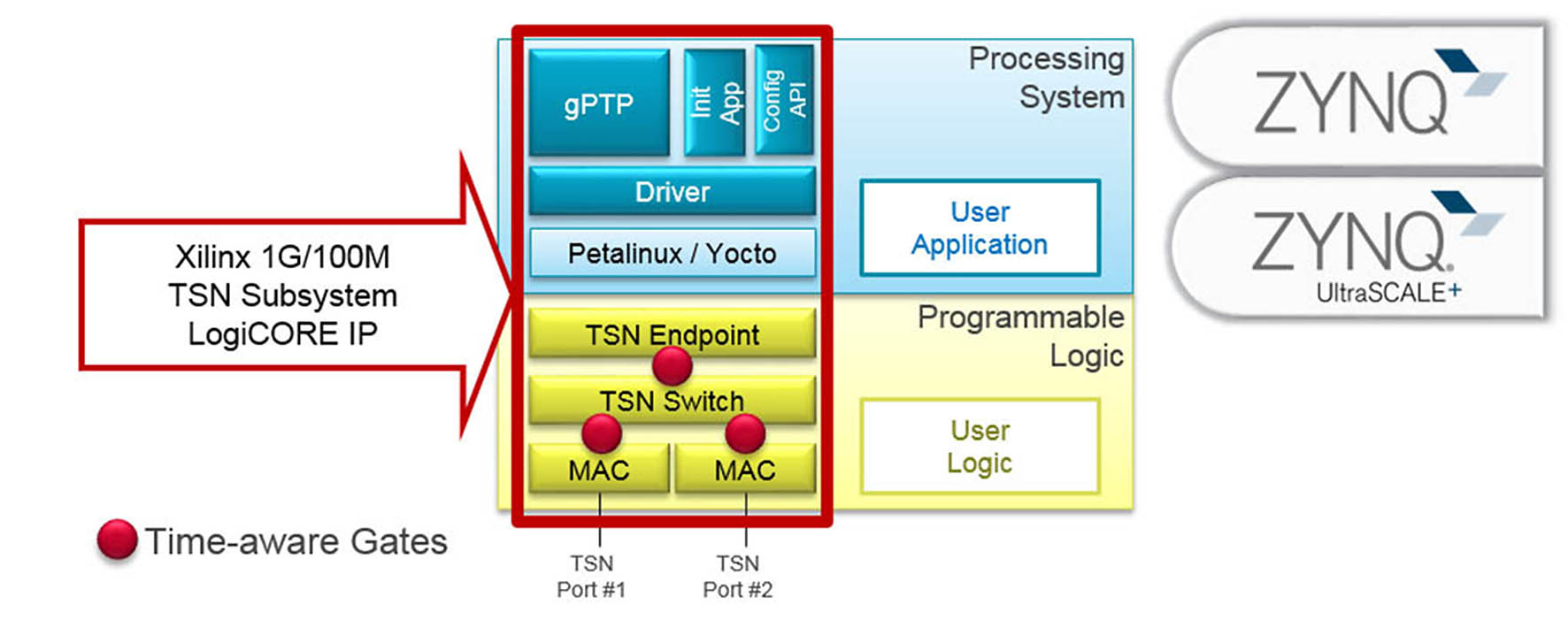 The support of any-to-any interfacing and the ability to couple coupled Processing System and Programmable Logic makes the Zynq-7000 and Zynq UltraScale+ MPSoC devices ideal to implement TSN next to a user application.