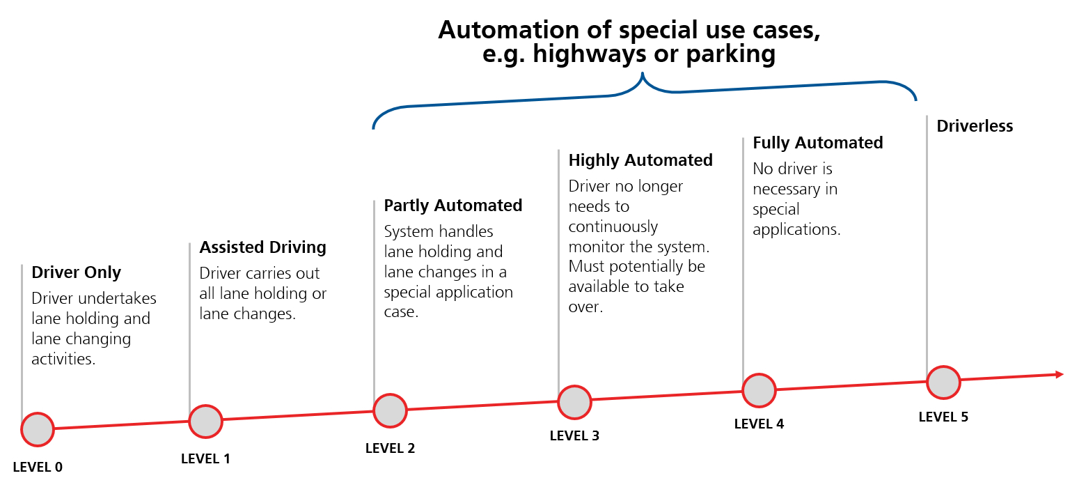 While today’s vehicle fleet continues to be dominated by vehicles that are entirely controlled by their driver, an increasing number of them offer at least some assisted driving capabilities. Moving towards fully autonomous driving will require incrementally increasing the level of automation in special use cases, such as on highways or for parking. Whereas today, drivers may benefit from assisted driving (Level 1 in the figure below), they are still required to carry out all lane holding and lane change maneuvers. Some cars on the roads today are already in Level 2, with partly automated systems that carry out these actions autonomously in special application cases. In highly automated driving (Level 3), drivers will be able to let go of the wheel in special application cases but will have to be prepared to take over if necessary. Fully automated driving (Level 4) will no longer necessitate the driver – albeit still in special use cases. Only when these levels are cleared will we be able to extend the applicability of driverless vehicles to all use cases (Level 5).