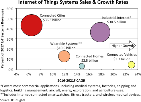 The $93.9 billion top-line projection for total IoT systems sales in 2018 remains unchanged from the original MD18forecast released in November 2017, but dollar volumes in end-use categories were adjusted due to slight changes in expected growth rates and also because $2.5 billion in revenues were reclassified and moved from the large connected cities segment to the broad-ranging Industrial Internet group, which covers most commercial applications, including medical. IoT systems revenues for industrial Internet applications are now forecast to grow 17.7% in 2018 to $35.9 billion, while the connected cities segment—covering government-funded infrastructure, “smart” roadways and bridges, streetlights, power grids and other utilities, public-safety video security networks, environmental and weather monitors, and other systems—is expected to increase 7.0% this year to $38.8 billion.