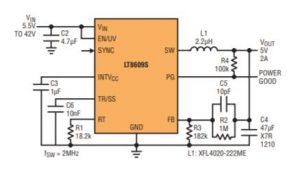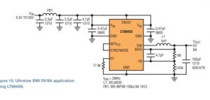 Due to the limited space and limited battery power, high efficiency and small solution size are top requirements for power converters. Low noise is a given. LT8609S is a suitable solution for all these applications. It’s designed with 3V to 42V input voltage range for automotive battery conditions. Integrated MOSFETs, built-in compensation circuit and 2MHz operation frequency minimize the LT8609S solution size. Silent Switcher 2 technology and integrated hot loop capacitors are used in the LT8609S to minimize noise levels and provide exceptional efficiency as well as excellent EMI performance. Figure 5 shows a 2MHz, 5V/2A application using LT8609S.