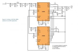 Figure 1 shows a dual output, 2MHz 5V at 4A and 1V at 4A, solution using two channels of the LT8650S. This circuit can be easily modified to fit other output combinations, including, for example 3.3V & 1.8V or 3.3V & 1.1V, to take advantage of the wide input range of the LT8650S. The LT8650S can also be used as the first stage converter, followed by various lower power second-stage switching or LDO regulators for more outputs.