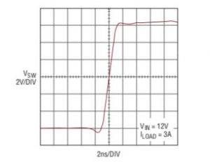 There are a limited number of monolithic buck regulators that can take 48V nominal inputs, most supporting less than 5A. The LT8645S monolithic buck regulator supports 8A loads, from input voltages up to 65V. Its 40ns minimum TON with fast clean switching edges (Figure 9) enable high switching frequencies and high efficiency, up to 94% at 2MHz.