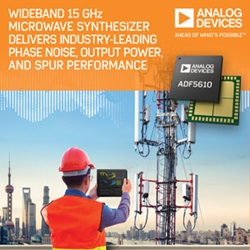 Analog Devices, Inc. (ADI) announced today a wideband synthesizer with an integrated voltage-controlled oscillator (VCO) that delivers breakthrough performance and flexibility and is ideal for diverse market applications such as aerospace and defense, wireless infrastructure, microwave point-to-point links, electronic test and measurement, and satellite terminals. ADI’s new ADF5610 wideband fractional-N synthesizer generates RF outputs from 55 MHz to 15 GHz and provides the industry’s lowest phase noise performance on a single chip. When compared to alternative solutions that require multiple narrowband GaAs voltage controlled oscillators and phase-locked loops(PLLs), the ADF5610 offers 50% less power dissipation, smaller footprint and simpler architecture which translates into bill of materials cost savings and reduced time to market.