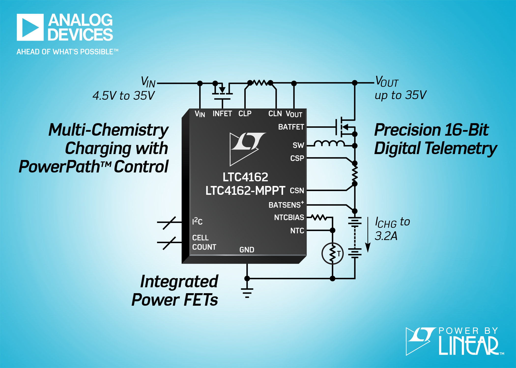 Analog Devices announces the Power by Linear™ LTC4162, a highly integrated, high voltage multi-chemistry synchronous monolithic step-down battery charger and PowerPath™ manager with onboard telemetry functions and optional maximum power point tracking (MPPT). The LTC4162 efficiently transfers power from a variety of input sources, such as wall adapters, backplanes and solar panels, to charge a Li-Ion/Polymer, LiFePO4 or lead-acid battery stack and provide power to a system load up to 35V. The device provides advanced system monitoring and PowerPath management, plus battery health monitoring. While a host microcontroller is required to access the most advanced features of the LTC4162, the use of the I2C port is optional. The main charging features of the product can be adjusted using pin-strap configurations and programming resistors. The device offers precision ±5% charge current regulation up to 3.2A, ±0.75% charge voltage regulation and operates over a 4.5V to 35V input voltage range. Applications include portable medical instruments, USB power delivery profile 1-5 devices, military equipment, industrial handhelds and ruggedized notebook/tablet computers.