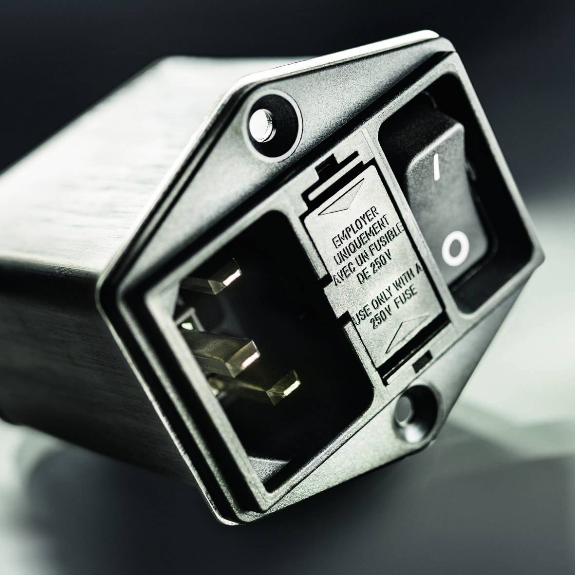 The DD12 filter series combines an IEC C14 appliance plug with a 1- or 2-pole fuse holder, a 1- or 2-pole switch and a high-quality mains filter. The particularly wide metal flange (horizontal or vertical) contacts the housing surface over a large area and thus enables an optimum filter and shielding effect with a large number of mounting variants.