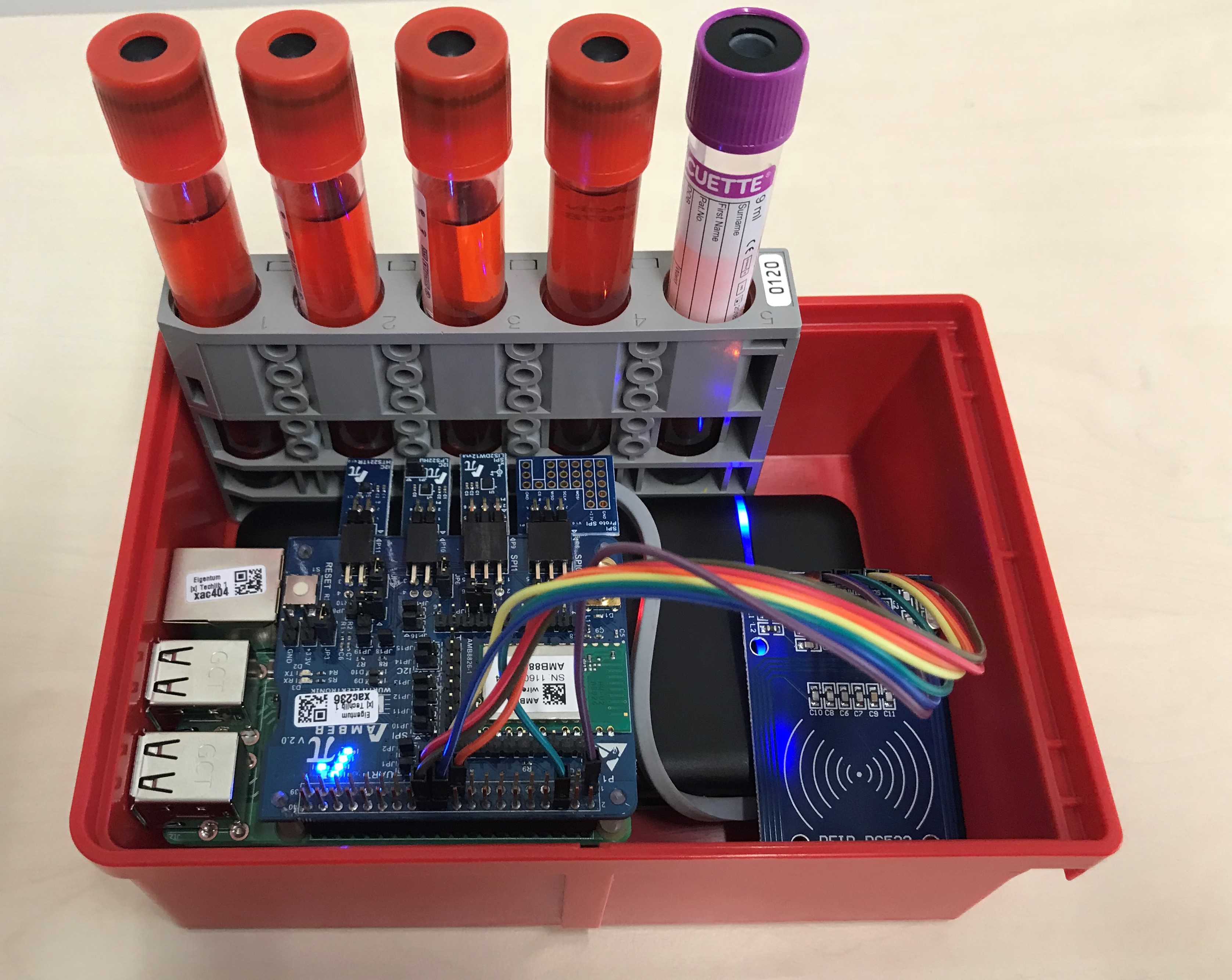 Based on the AMBER PI design kit of eiSmart, a development and expansion board for a Raspberry Pi that has a Sub-1-GHz radio interface and various sensors, the first working prototype of the tracking solution was developed by the time of the final TECHSLAM on Sunday. The required data could be collected via the sensors of the AMBER PI and the enclosed AMB8826 radio stick provided them quickly and available at any time on a data platform.