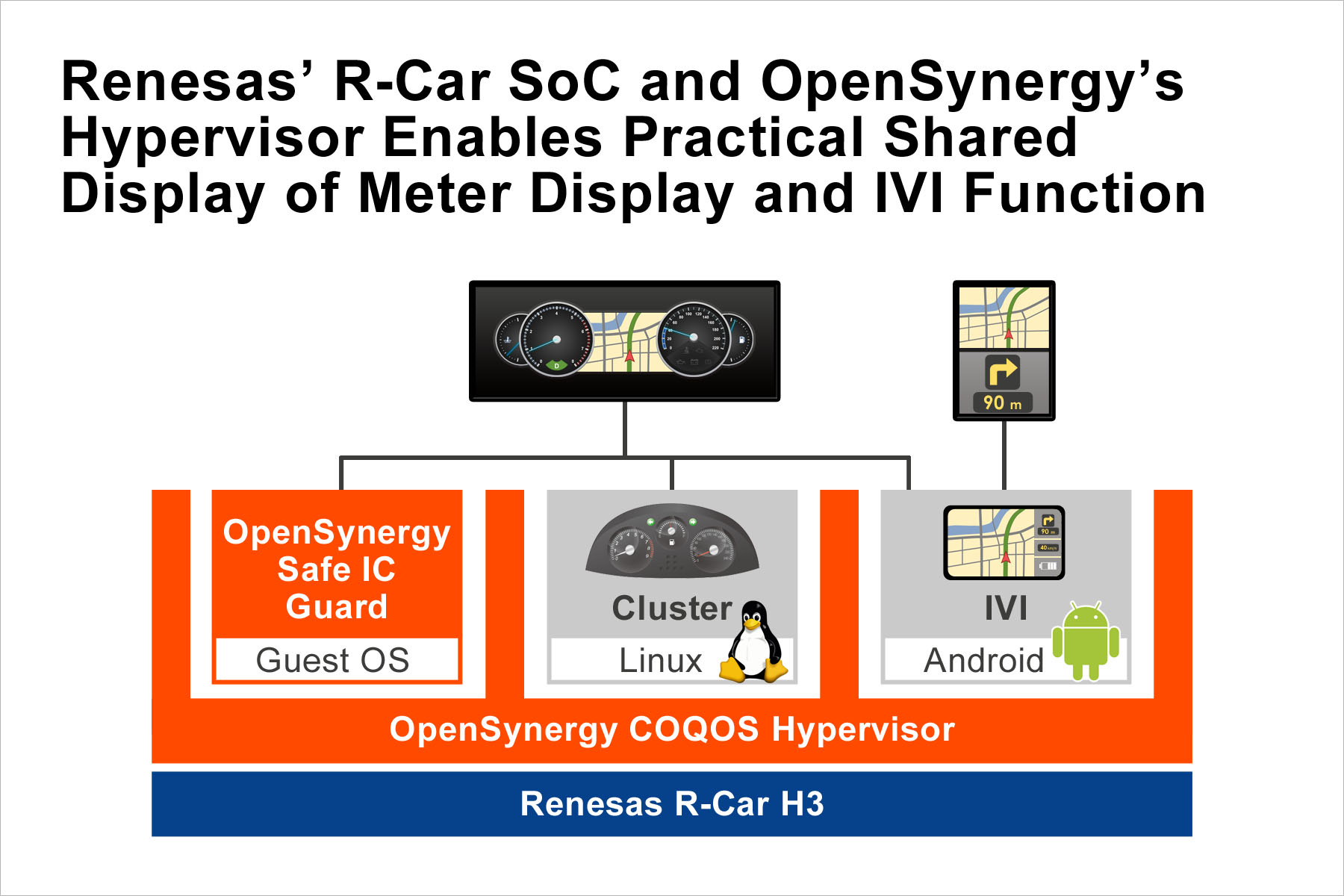 Renesas’ automotive R-Car H3 SoC provides the optimum function and performance for integrated cockpits and connected cars. The R-Car H3 GPU and video/audio IP incorporates virtualization functions, making virtualization by the hypervisor possible and allowing for multiple OSs to operate independently and safely.