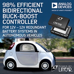 Analog Devices announces the Power by Linear™ LT8708/-1, a 98% efficient bidirectional buck-boost switching regulator controller that operates between two batteries that have the same voltage, which are ideal for redundancy in self-driving cars. The LT8708/-1 operates from an input voltage that can be above, below or equal to the output voltage, making it well suited for two each 12V, 24V or 48V batteries commonly found in electric and hybrid vehicles. It operates between two batteries and prevents system shutdown should one of the batteries fail. The LT8708/-1 can also be used in 48V/12V and 48V/24V dual battery systems.