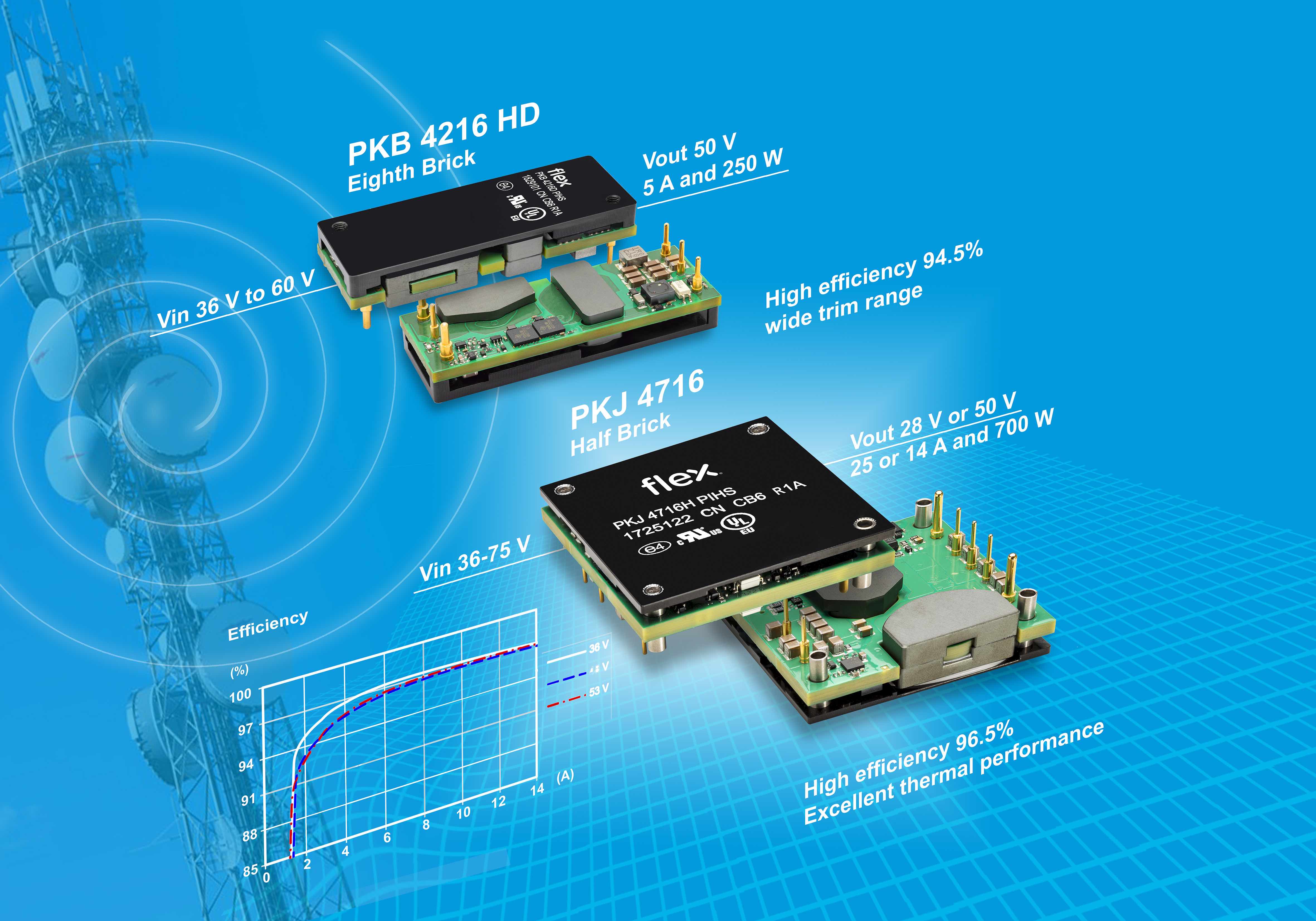 Flex Power Modules announces the PKB4216HDPI, the latest model in its series of DC-DC converters aimed at Radio Frequency Power Amplifier (RFPA) applications in the telecom market segment. Following on from the recently introduced 750W PKJ4000 series, the PKB-D is a high-density converter in the industry standard eighth-brick format with an output of 50V at 5A, and an input voltage range of 36 to 60V. This makes it ideal for 50V GaN based RFPA’s and also high voltage LDMOS applications.