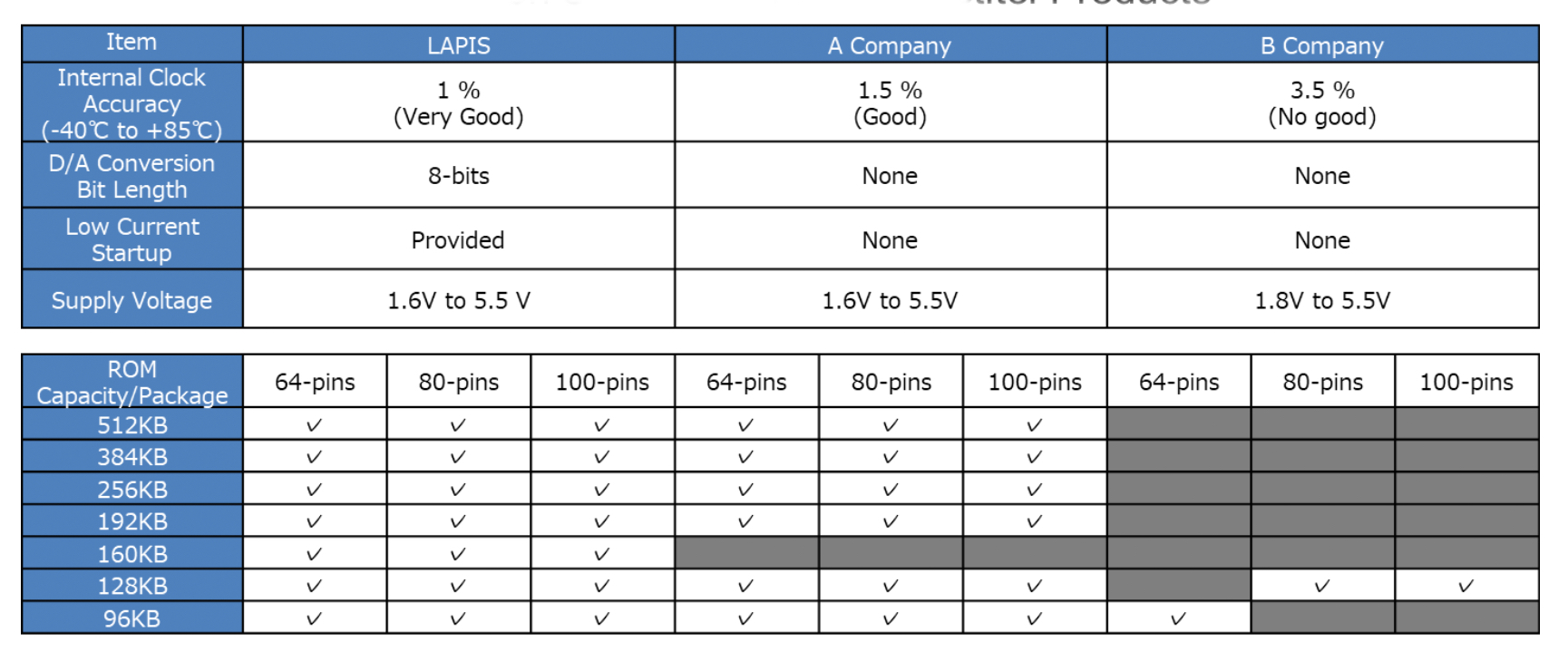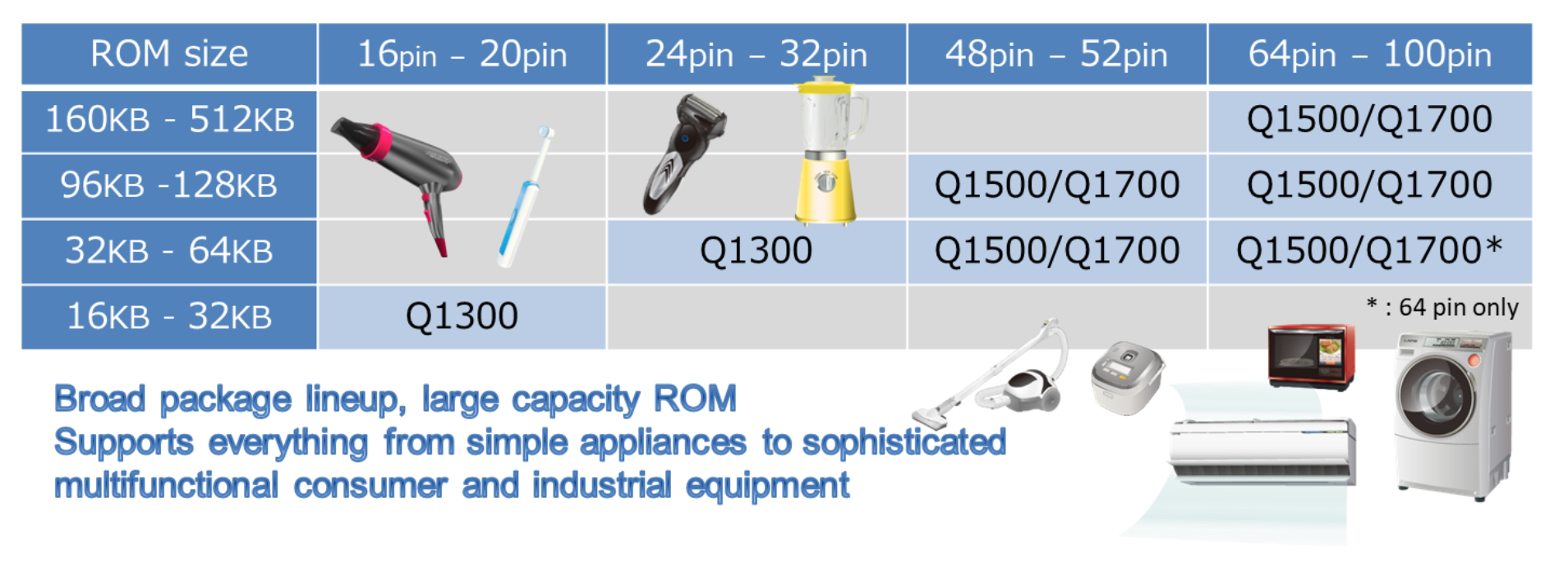 LAPIS Semiconductor’s wide range of MCUs available in different package types and program ROM capacities supports the home appliance and compact industrial equipment markets which are becoming increasingly sophisticated and multi-functional, allowing users to select the ideal solution to fit system requirements (i.e. mounting area, costs).