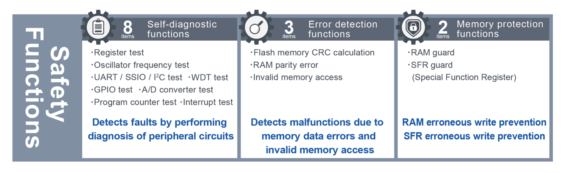 Since the microcontroller controls peripheral components, it is possible to detect failures in advance and avoid malfunctions by performing periodic diagnosis. However, the MCU must also be able to detect internal faults and terminate operation before returning to the initial state.