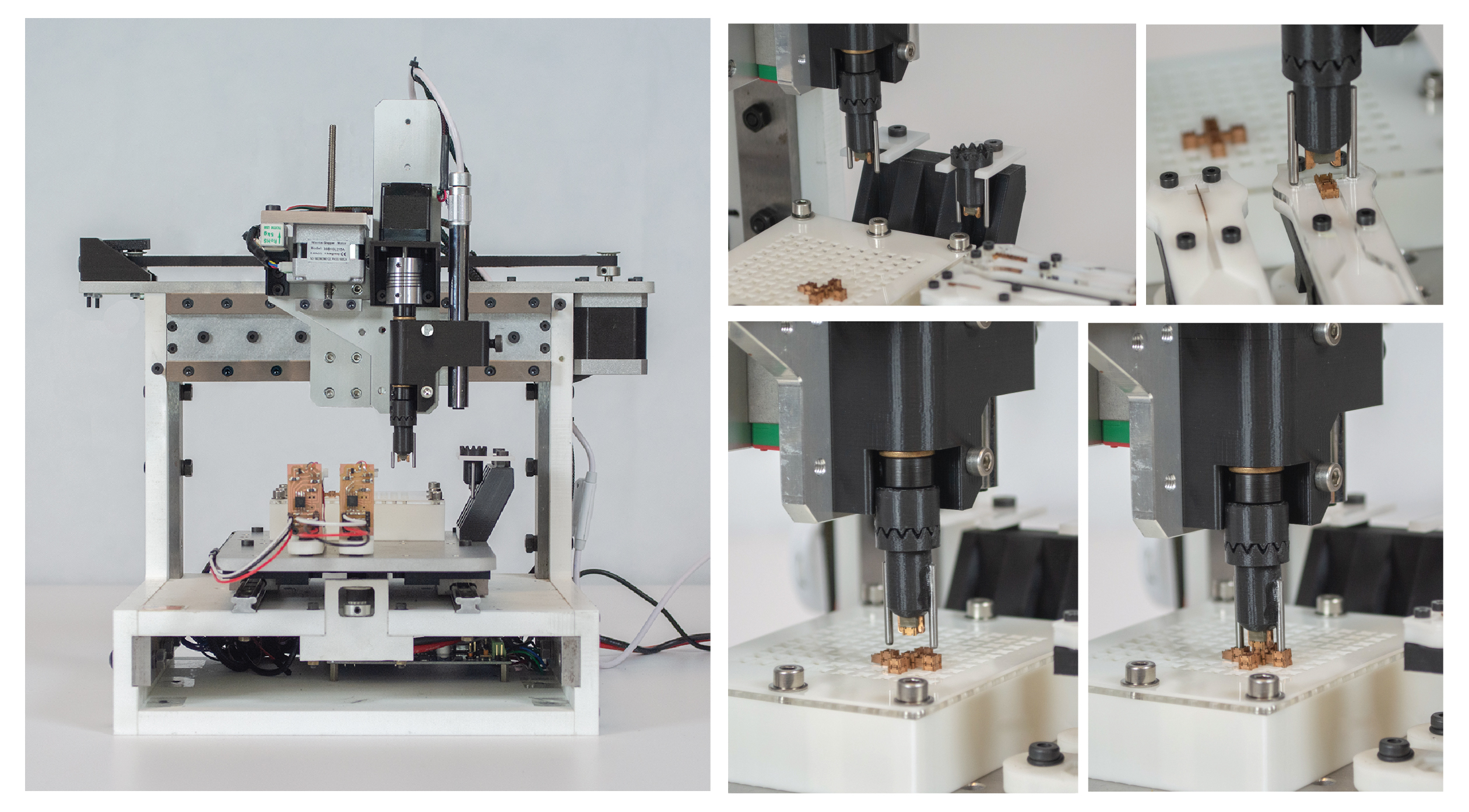 The simplicity and regularity of these structures makes it relatively easy for their assembly to be automated. To do that, Langford has developed a novel machine that’s like a cross between a 3-D printer and the pick-and-place machines that manufacture electronic circuits, but unlike either of those, this one can produce complete robotic systems directly from digital designs. Gershenfeld says this machine is a first step toward to the project’s ultimate goal of “making an assembler that can assemble itself out of the parts that it’s assembling.”