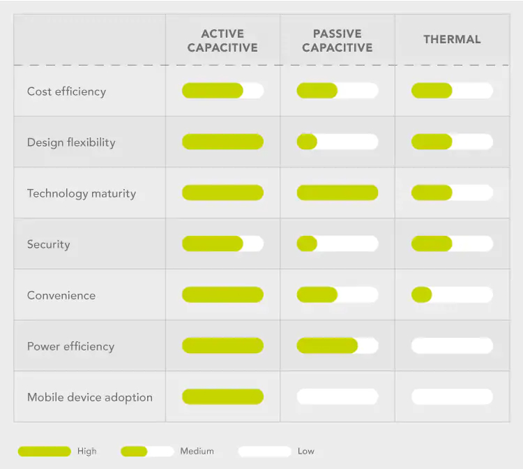Having analyzed the pros and cons of different sensors, the active capacitive technology is the best option for integration onto a smartcard. Active capacitive sensors generate an image by measuring the variations in electrical capacitance created by the ridges and valleys in the fingerprint and are, unlike passive capacitive, robust and works for different skin types and conditions, while thermal sensors generate an image by measuring the variations in temperature that ridges and valleys create and are more power hungry.