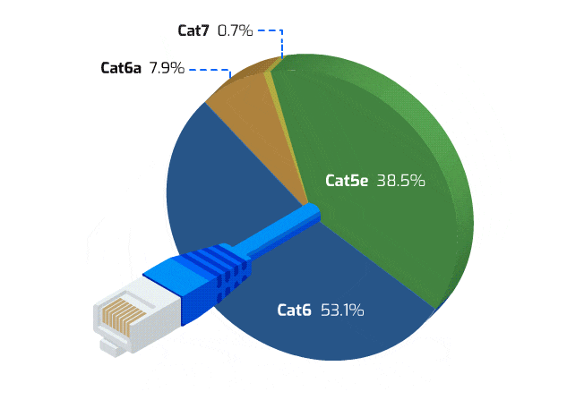 figure 2: : Examining the installed Ethernet outlets by cable type shows that currently CAT 5e and CAT 6 cabling dominates the market while CAT 6a and CAT 7 cabling is only just starting to emerge to support higher data rates. The low-cost CAT 6 cable is one reason why camera vendors have adopted 5GBASE-T, a standard that operates at 5Gbits/s at distances of 100m over CAT 6 cable.